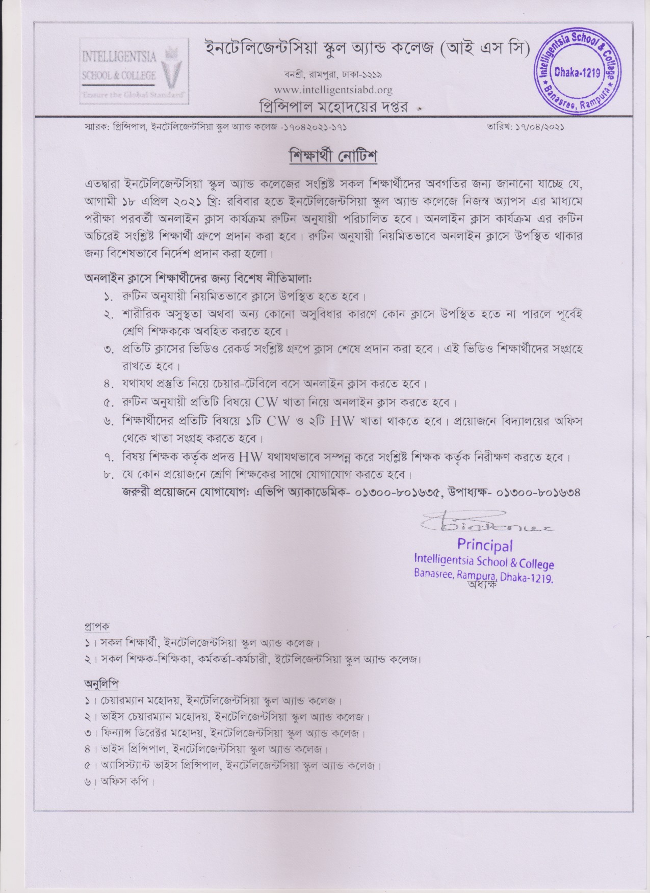 শিক্ষার্থী নোটিশ ( অনলাইন ক্লাস সম্পর্কিত নির্দেশনা) Published on Wednesday, April 21, 2021