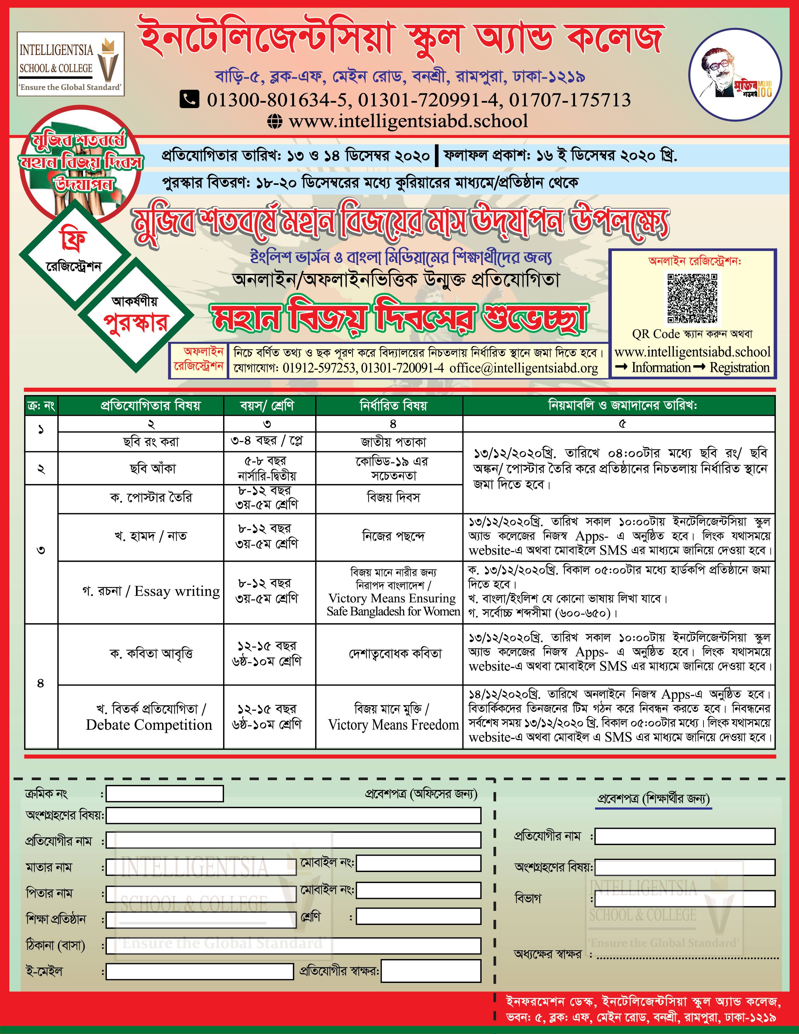 জাতীয় বিজয় দিবস ২০২০ দিবস উপলক্ষ্যে ইনটেলিজেন্টসিয়া স্কুল অ্যান্ড কলেজ এর প্রতিযোগিতার আয়োজন Published on Wednesday, December 9, 2020